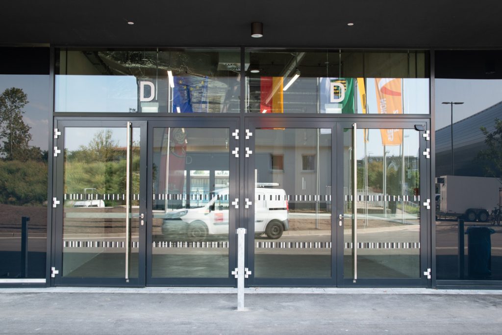 Zur Vermeidung von Unfällen haben wir einen Durchlaufschutz in Form von Fensterbeschriftungen installiert, die vor dem ungewollten Laufen gegen Glas schützen. Für die Orientierung im Außenbereich setzten wir robuste, wetterfeste Schilder ein, die eine klare Wegweisung gewährleisten.